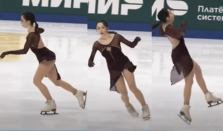 Начнем с коронного прыжка Елизаветы, трикселя. Лиза заезжает на данный прыжок по дуге. Отрыв полубоком, полуспиной.