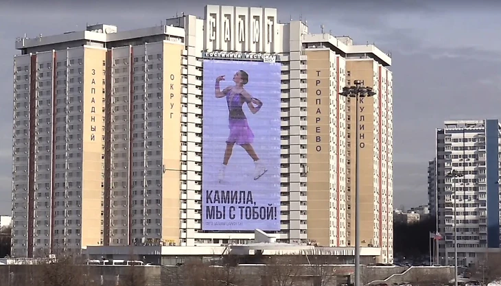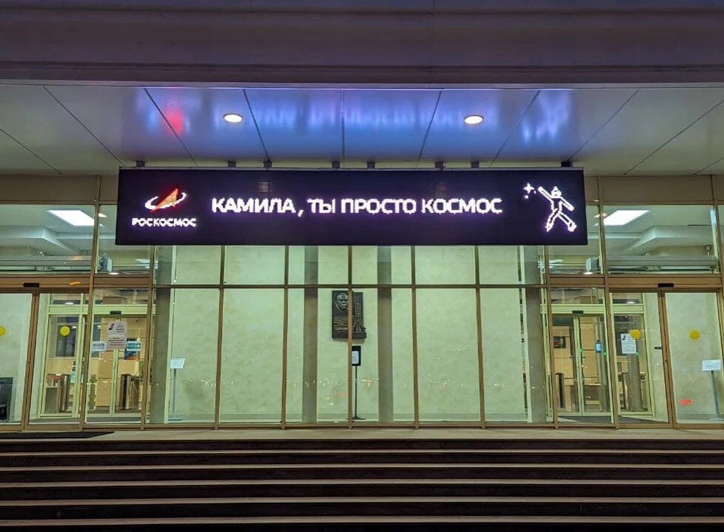 Роскосмос разместил на входе в штаб-квартиру обращение к фигуристке: «Камила, ты просто космос!» А в соцсетях написал: «Верим в победу! Желаем удачи! Ждем дома!»