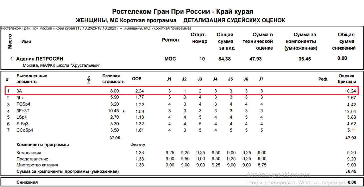 В тренерском штабе Этери Тутберидзе почему-то считают, что своих соперников их воспитанники должны не просто побеждать, а побеждать непременно с отрывом минимум 10 баллов. Поэтому для тренирующихся в МАФКК школа «Хрустальный» фигуристов исполнение элементов высшей категории сложности является обязательным. Вот и на проходящем в Уфе первом этапе Гран При России по фигурному катанию подопечная Тутберидзе Аделия Петросян в короткой программе предприняла попытку исполнить один из таких элементов -- тройной Аксель Паульсен. Элемент у Аделии получился с недокрутом вполоборота, за что по существующим правилам судьи были обязаны понизить его базовую стоимость. А теперь предлагаю вашему вниманию скриншот протокола выступления Аделии Петросян: