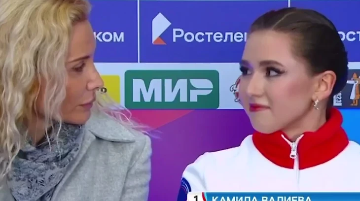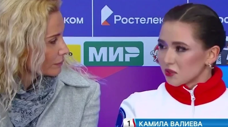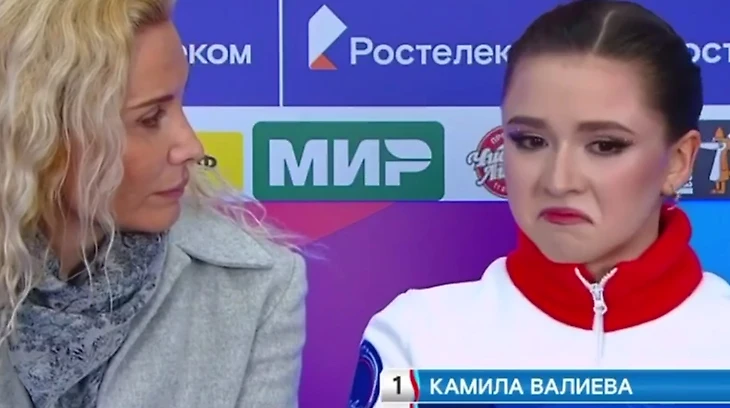 После объявления оценок, когда стало понятно, что Валиева вышла на первое место, камера крупно выхватила ее лицо.