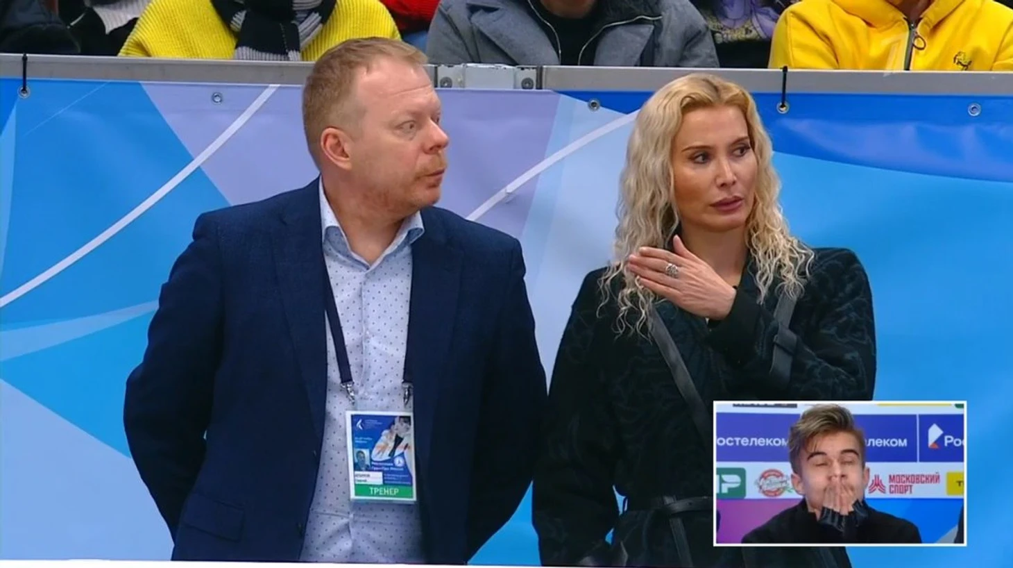 А следом камера выхватил Тутберидзе – она отчитала своего воспитанника.