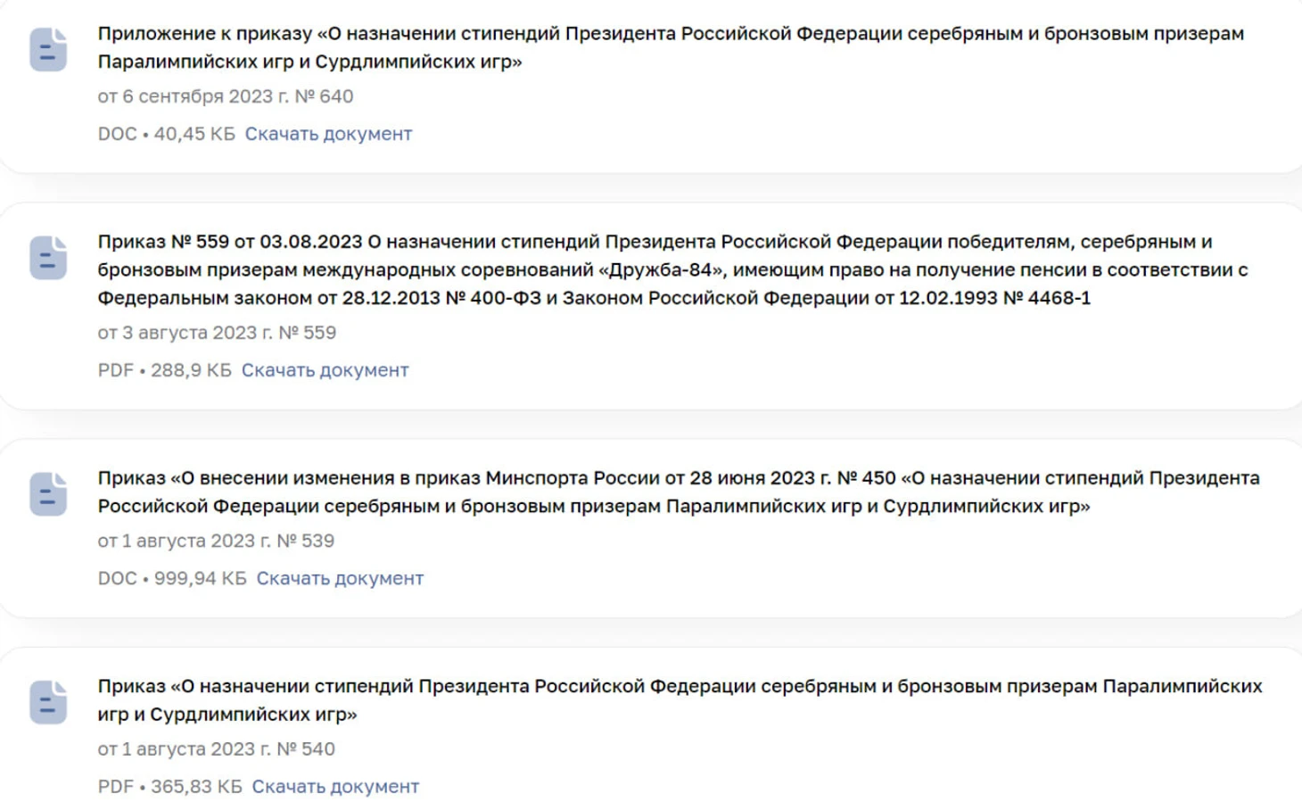 Его невозможно найти – в хронологическом порядке за приказом № 450 (1 августа 2023 года) «О внесении изменения в приказ Минспорта России» сразу следует приказ № 559 (03 августа 2023) «О назначении стипендий Президента Российской Федерации победителям, серебряным и бронзовым призерам международных соревнований «Дружба-84».