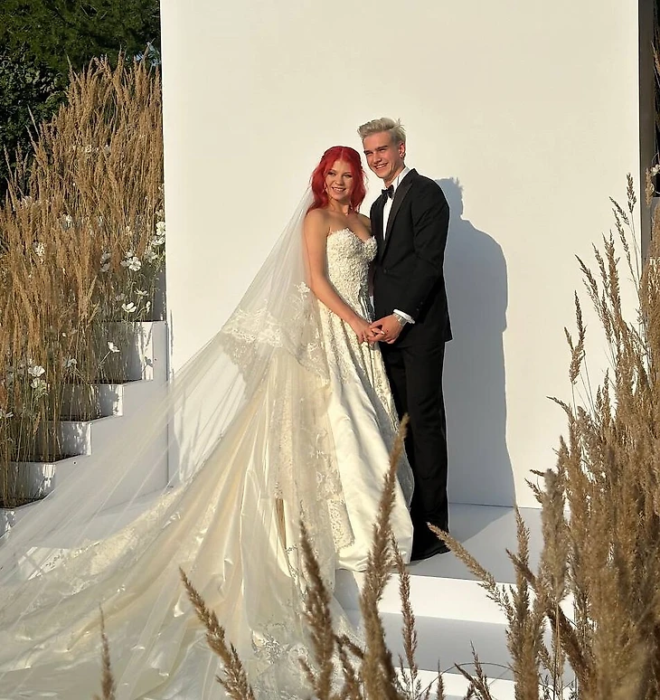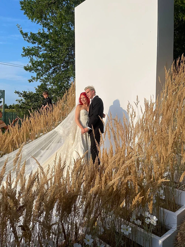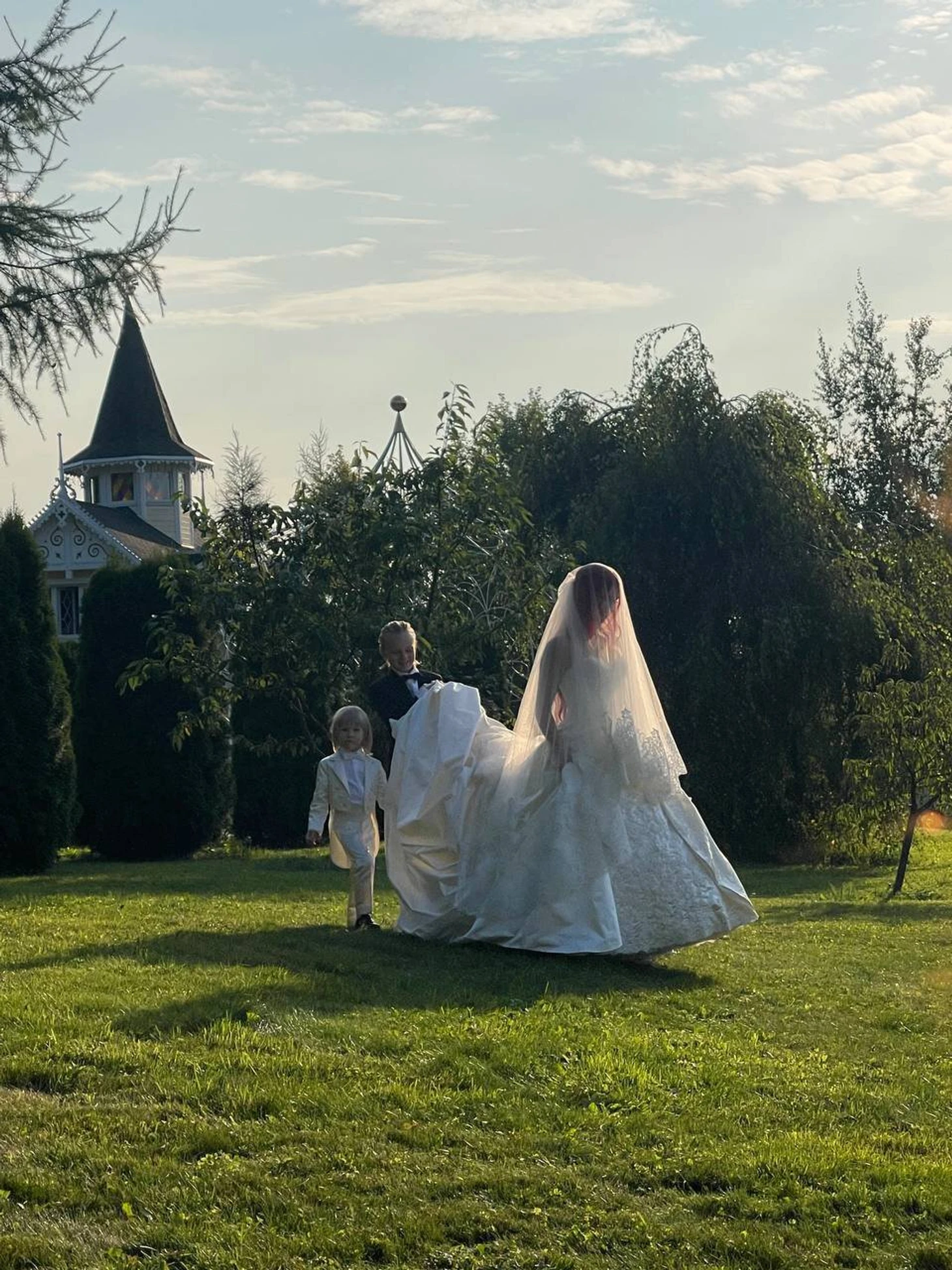 Вечерняя часть свадьбы проходила на природе. На фоне сказочного пейзажа Саша шла к Макару в новом платье. На этот раз в очень пышном и с длинным шлейфом, несли который сыновья Рудковской и Евгения Плющенко – Саша и Арсений.