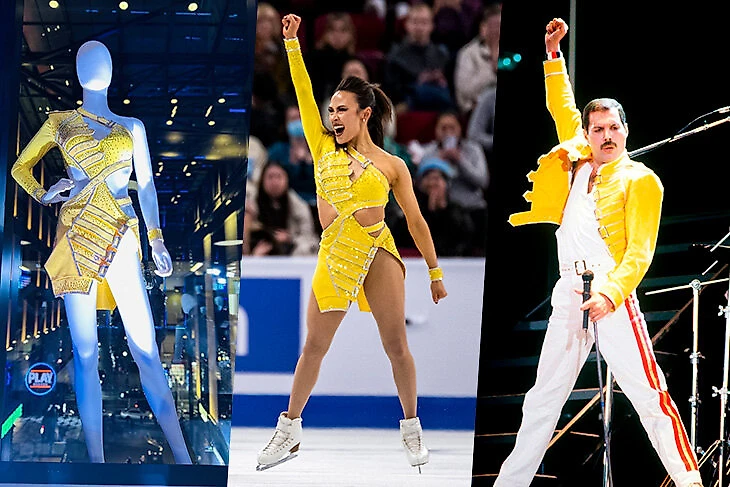 Два платья прошлого сезона – который принес дуэту второе золото ЧМ. Для ритм-танца под музыку группы Queen Кэрон переосмыслил легендарный пиджак Фредди Меркьюри – любимого Чок желтого цвета.