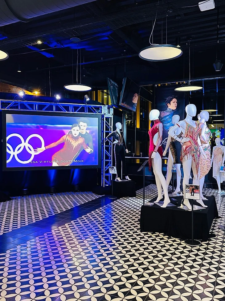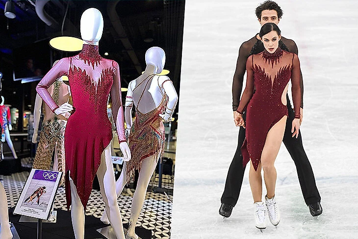 ● На центральном подиуме – самое легендарное платье Олимпиады-2018 в Пхенчхане. Бордовый лаконичный наряд Тессы Виртью для произвольной программы «Мулен Руж» – вместе с партнером Скоттом Мойром она тогда второй раз выиграла Олимпиаду.