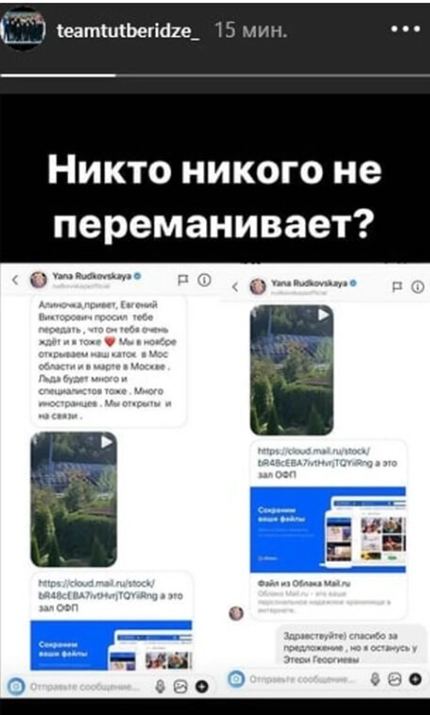 Оказывается, Загитову тоже ждали в «Ангелах». Осенью команда Этери Тутберидзе выложила в соцсетях скрины переписки Рудковской и Загитовой: