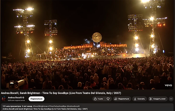 По легенде, Брайтман ужинала в ресторане, где Андреа Бочелли, икона оперной музыки, слепой с 12 лет, исполнял Con te partirò – и влюбилась в эту композицию раз и навсегда.