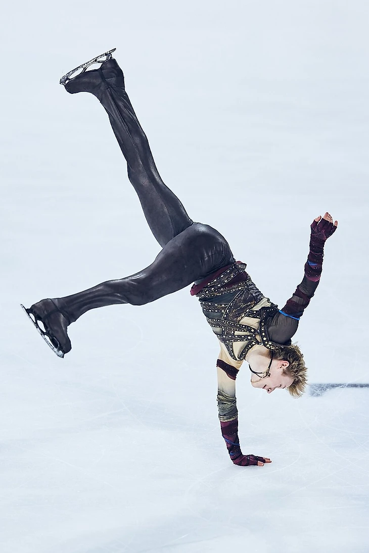 Малинин, в отличие от Адама Сяо Хим Фа, решил не экспериментировать с нарисованным прессом и сделал закрытый костюм. Но кожаные ремни, открытое плечо и обмотанные руки оставил.