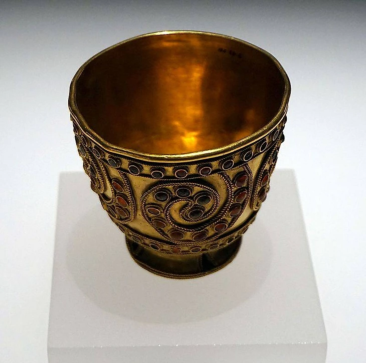 Однако центральный элемент оформления - чемпионский трофей, созданный по образу уникальной археологической находки Бронзового века: Триалетского кубка. Оригинал - тончайшая работа по золоту, выполненная передовым для своего времени методом: выдавливанием из тонкого листа червонного золота. Такая работа позволила обеспечить удивительную легкость кубка и сэкономить при этом драгоценный металл.