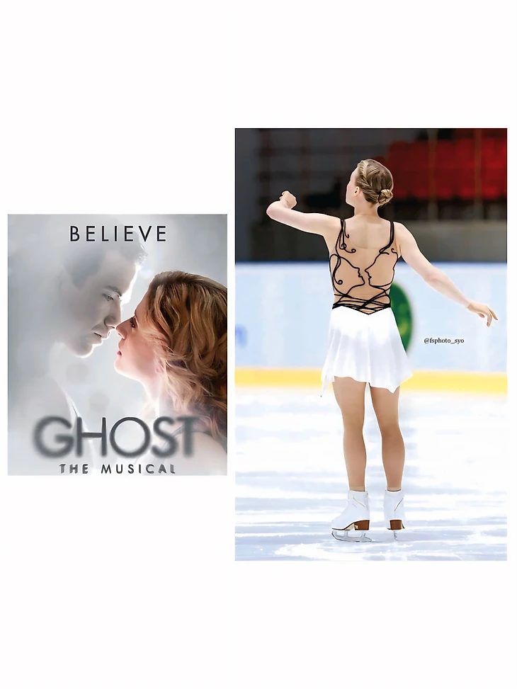 Платье Анастасии для программы на первый взгляд кажется опасно простым: белая ткань и лишь легкие черные линии на ней, как бы очерчивающие силуэт – велик риск потеряться на льду. Замысел дизайнера становится максимально понятным, когда мы видим спину Анастасии – два профиля словно застыли в мгновении до поцелуя – точная цитата постера мюзикла. Платье, визуально сливающееся со льдом также превращает Анастасию в некое призрачное создание, заставляя зрителя акцентировать внимание на лице и изящных движениях рук спортсменки - эффектно и очень тонко.