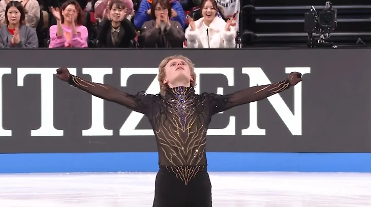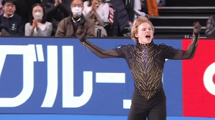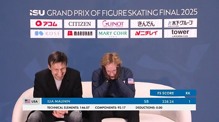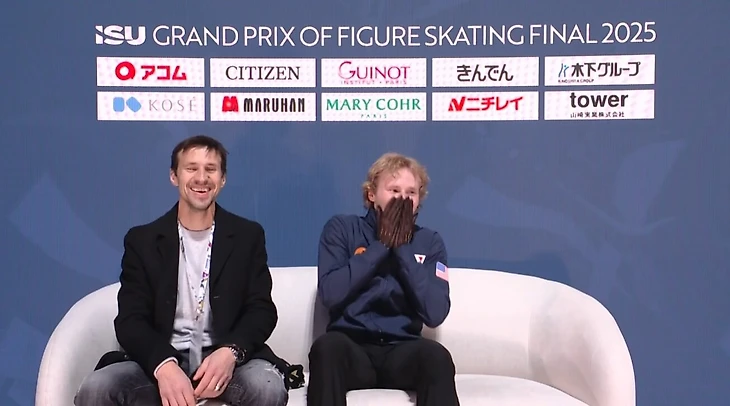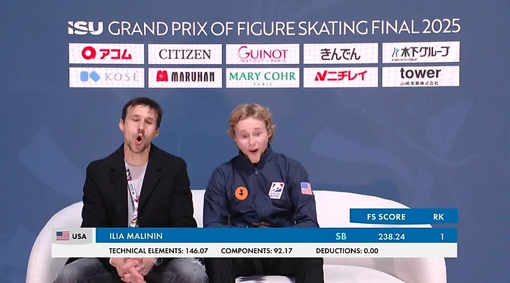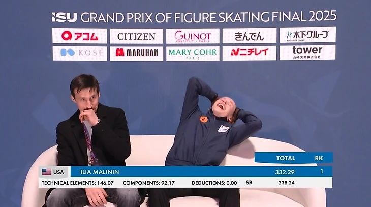 Даниэль Грассль, который тоже выдал классный прокат и лидировал до выхода Малинина, забавно кланялся Илье на камеру.