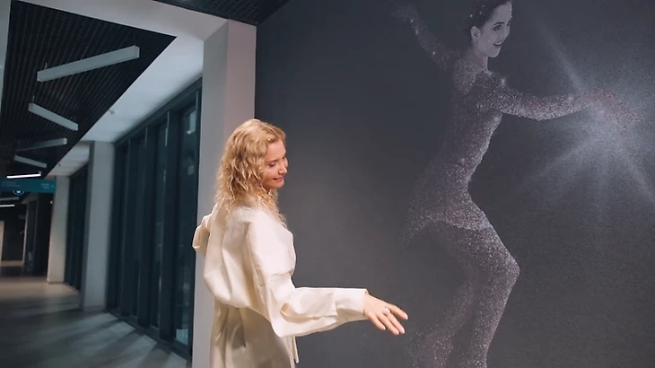 ● Серия начинается с общих планов нового катка: Тутберидзе показывает, что стены внутри украшены портретами учеников.