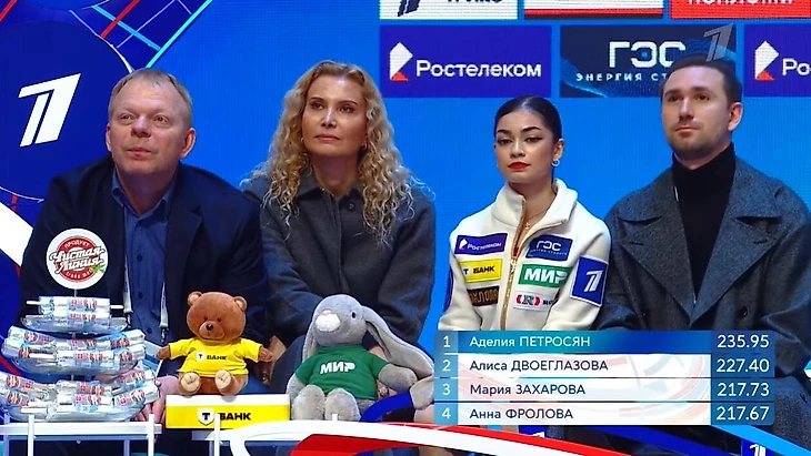 Петросян не справилась с тремя прыжками ультра-си из трех: тройной аксель – степ-аут и недокрут, четверной тулуп – падение, дальше – двойной тулуп вместе четверного.