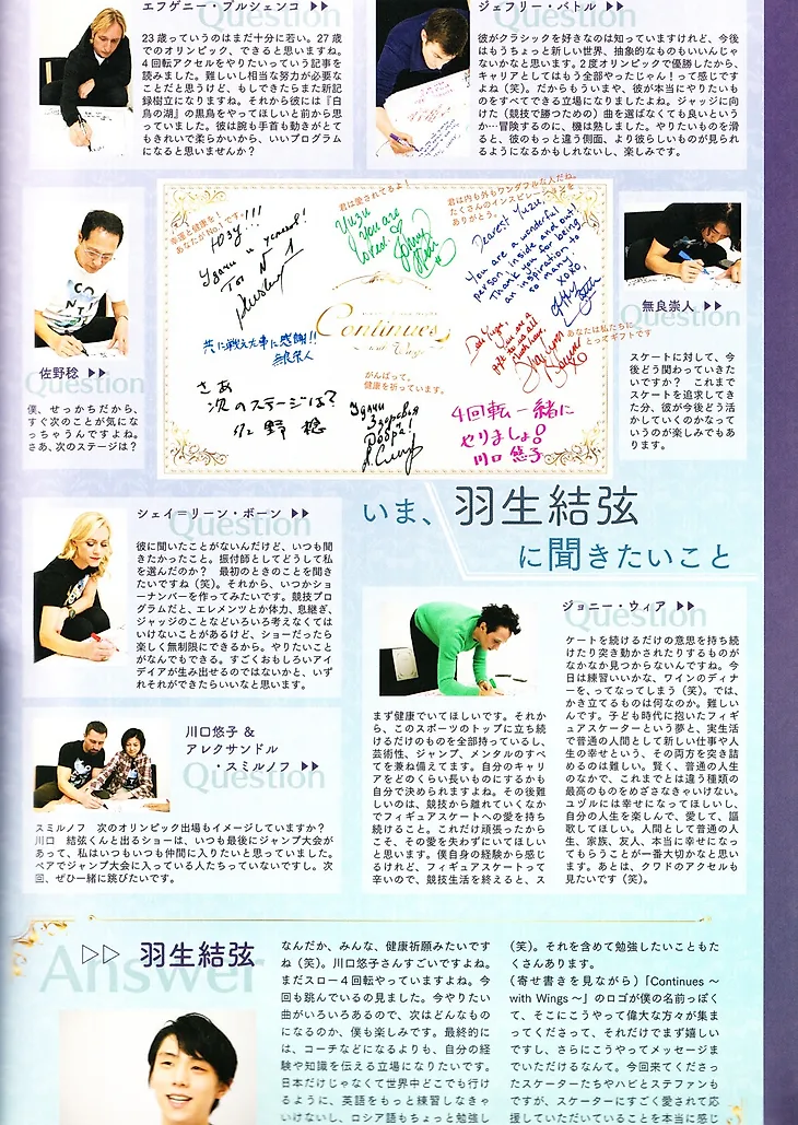 Перевод вопросов фигуристов шоу «Продолжаю ~с Крыльями~» к Юзуру, его ответ, а также специальное послание Стефана Ламбьеля. Приятного чтения.