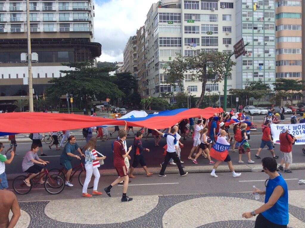 Болельщики сборной России перед матчем группового этапа ЧМ-2014 против Бельгии провели шествие по улицам Рио-де-Жанейро.