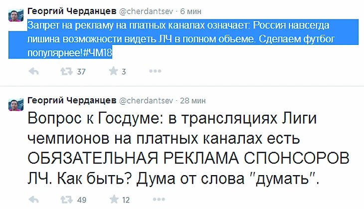 Запрет на рекламу на платных каналах означает: Россия навсегда лишена возможности видеть ЛЧ в полном объеме. Сделаем футбол популярнее!» – написал Черданцев в своем твиттере.