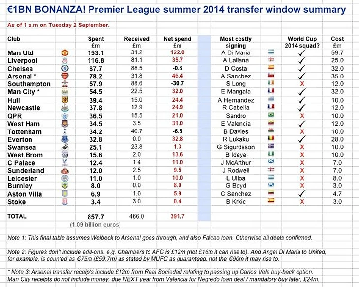 05.00 Таблица затрат английских клубов на трансферы сильно впечатляет – 857,7 миллиона фунтов за одно окно. Отрицательная разница между затратами и доходами тоже очень яркая – 391,7 миллиона.