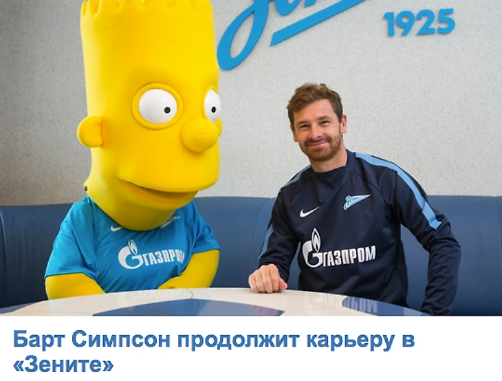 15.45 Первые подробности: «Футбольный клуб «Зенит» и компания «20th Century Fox» достигли договоренности о переходе Барта Симпсона в состав сине-бело-голубых! Новичок команды уже прибыл в Петербург, прошел медосмотр, подписал контракт и провел первую тренировку с основным составом!
