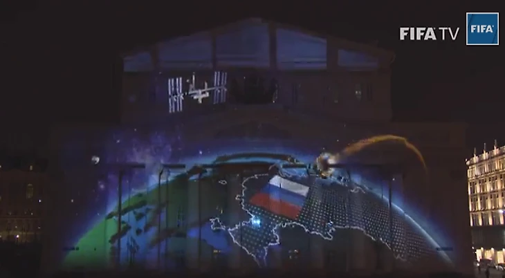 Видео было удалено администраторами канала FIFATV менее часа назад. Вместо него вскоре появилась видеозапись светового шоу на фасаде Большого театра, где уже нет фрагмента с картой России.