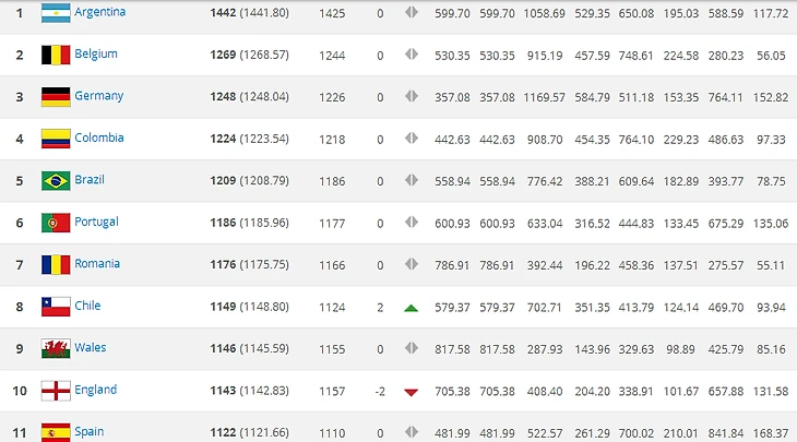 Рейтинг продолжает возглавлять сборная Аргентины (1442 очка). Второе место у команды Бельгии (1269 очков), сборная Германии сохранила третью строчку (1248 очков).
