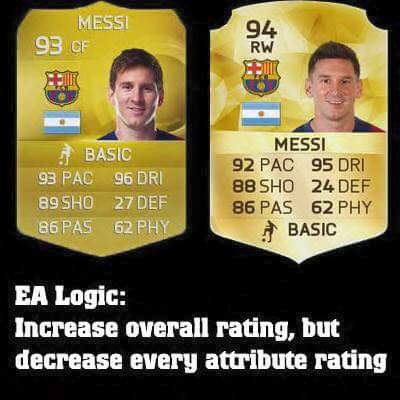 - это канадская логика авторов игры, рейтинг Месси вырос на единицу, но скорость, дрибблинг и удары стали хуже на единицу