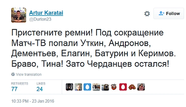 Комментаторы Василий Уткин, Алексей Андронов, Кирилл Дементьев, Александр Елагин, Владислав Батурин и Эльвин Керимов выведены за штат «Матч ТВ», сообщает краснодарский журналист Артур Каратай в своем твиттере. Георгий Черданцев при этом остается в штате.