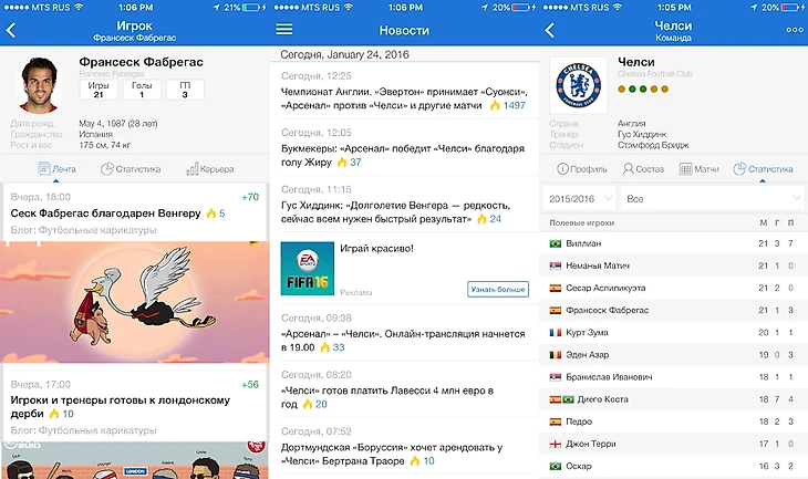 – Читать новостную ленту, интервью с игроками, мнения экспертов и информацию о трансферах;