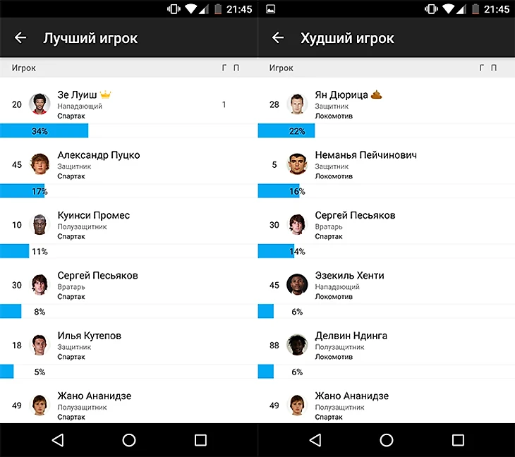 В настоящий момент в голосовании болельщиков за звание лучшего игрока матча «Локомотив» – «Спартак» (0:2) лидирует Зе Луиш, забивший второй мяч. Худшим игроком считают защитника «Локомотива» Яна Дюрицу, который поразил свои ворота в первом тайме. Вы можете повлиять на исход голосования, отдав свой голос на странице матча в приложении Scores & Video и Sports.ru.