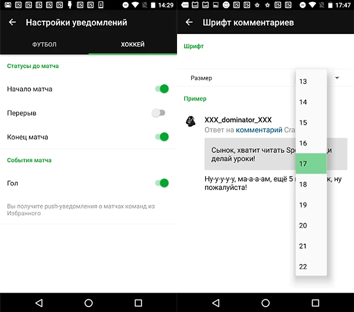 – Настройку размера шрифта. Вы сможете подобрать оптимальный размер шрифта для чтения новостей, материалов и комментариев;