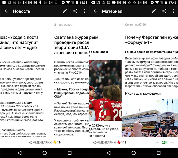 – Функцию «перелистывания» в новостях, материалах и на главной. Переход к следующей новости или материалу осуществляется простым свайпом влево;