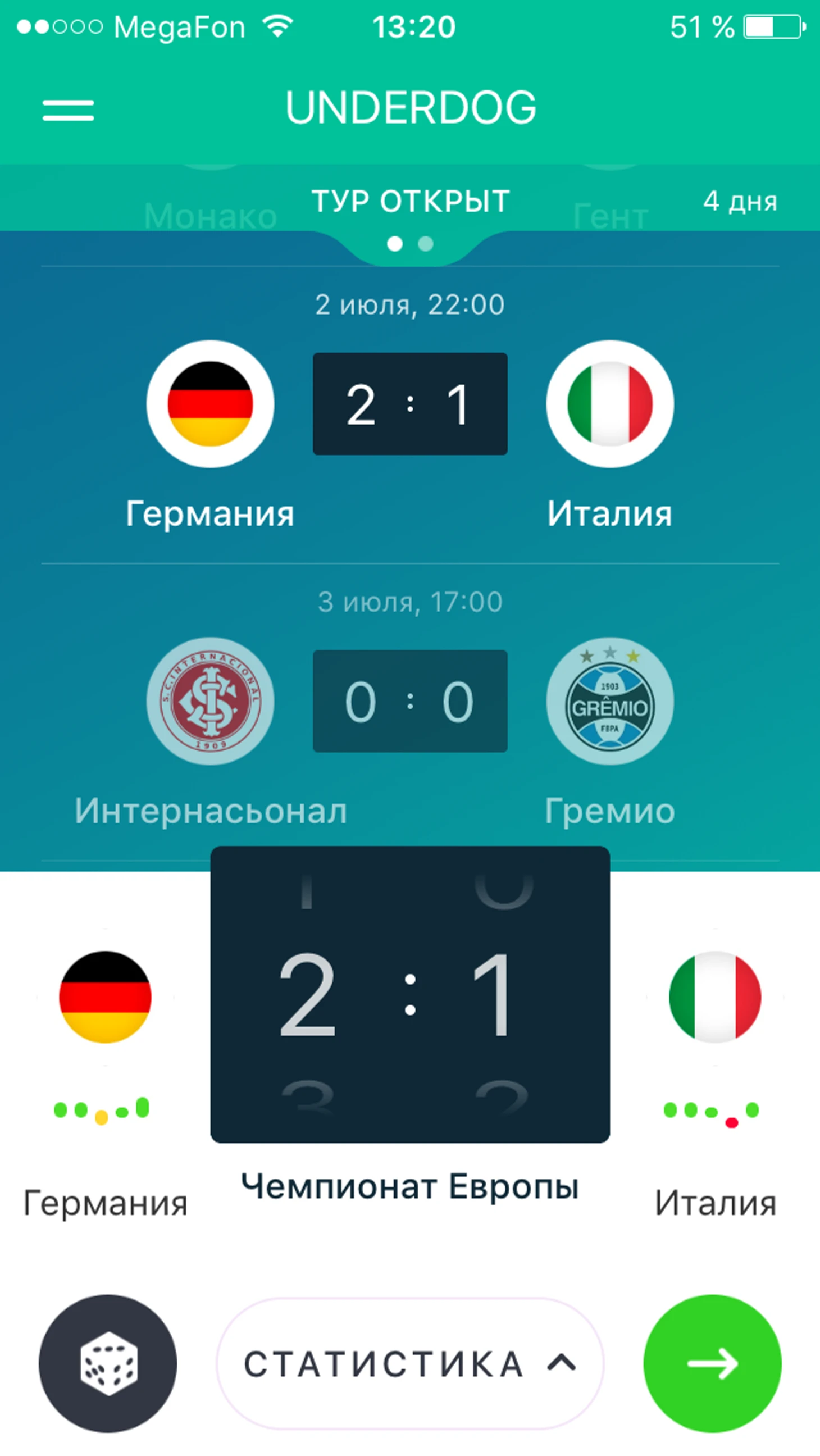 Не знаете на какой счет поставить? Потрясите телефон, и Underdog подскажет вероятный счет.