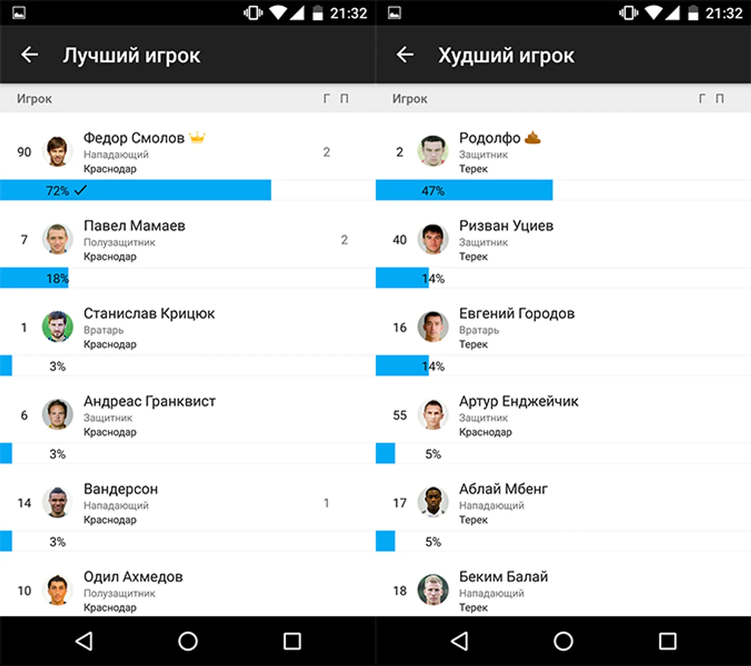 В голосовании болельщиков за лучшего игрока матча «Краснодар» – «Терек» #прямосейчас лидируют Федор Смолов, забивший два гола, и Павел Мамаев, отдавший две голевые передачи.