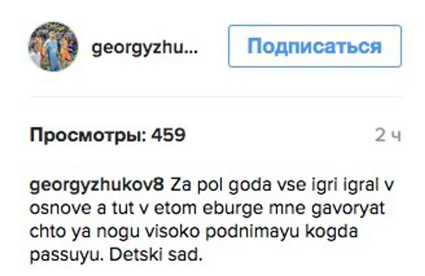 За полгода играл все игры в основе, а тут, в этом Ебурге, мне говорят, что я ногу высоко поднимаю, когда пасую. Детский сад», – написал Жуков в своем аккаунте в Instagram.