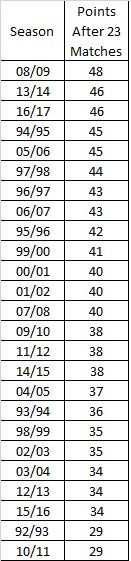 Это очки Ливерпуля после 23 игр в чемпионате во всех сезонах АПЛ. При этом у Клоппа нет Суареса, Джеррарда и ещё кучи звёзд, которые были у Роджерса.
