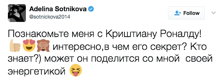 «Познакомьте меня с Криштиану Роналду! Интересно, в чем его секрет? Кто знает? Может, он поделится со мной своей энергетикой», – написала Сотникова в твиттере.