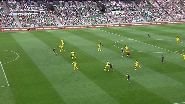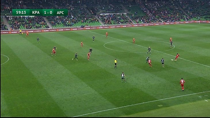 21-я минута, 0:0. Смолов выходит один на один с вратарем. На стоп-кадре четко видно, что нападающий находится в правильной позиции, однако ассистент главного судьи поднимает свой флажок, определяя у него офсайд.
