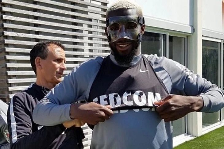 Хавбек «Монако» Тьемуэ Бакайоко тренируется в защитной маске.