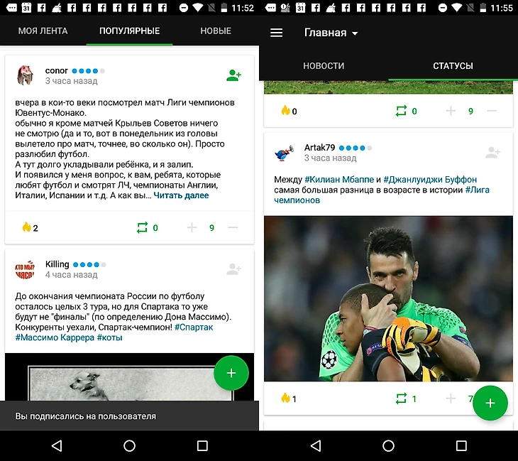 Подписываться на пользователей можно прямо в ленте. Лента статусов теперь есть и на «Главной».