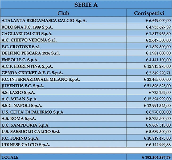 В пятерку также вошли «Интер» (23,5 млн), «Милан» (15,6), «Наполи» (12,99) и «Фиорентина» (12,91).
