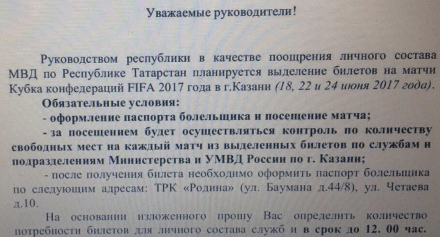 В распоряжении Sports.ru оказалось письмо по МВД Татарстана о бесплатном распределении билетов среди личного состава Министерства внутренних дел. Оно предполагает при этом проверку посещаемости казанских матчей турнира по распределенным билетам.