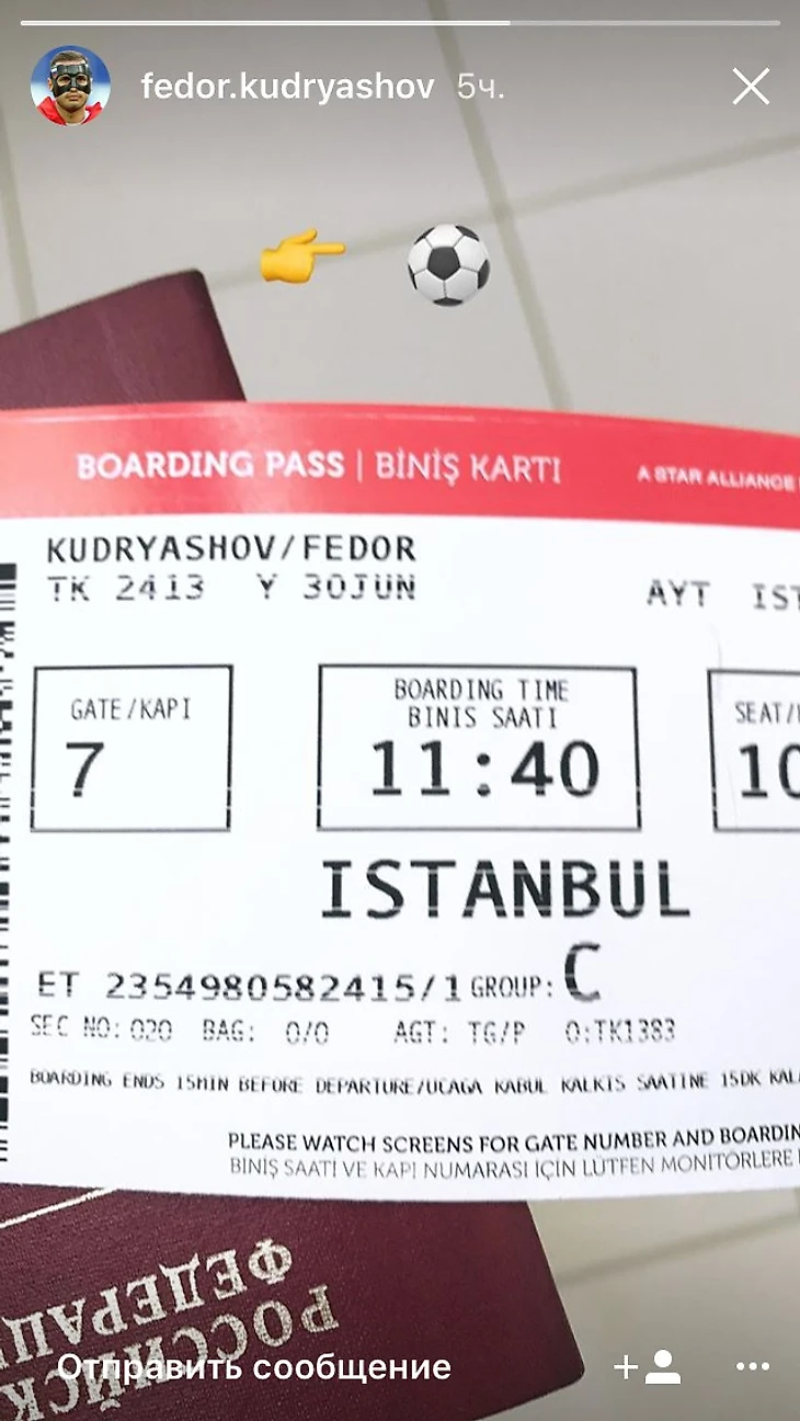 Защитник «Ростова» Федор Кудряшов опубликовал в сториз в инстаграме фотографию билета в Стамбул.