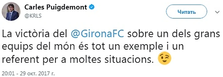 Президент самопровозглашенной Каталонской Республики Карлес Пучдемон отреагировал на победу «Жироны» над мадридским «Реалом» (2:1) в 10-м туре испанской примеры.