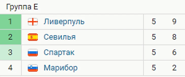 Если «Спартак» победит «Ливерпуль», а «Севилья» сыграет вничью с «Марибором», то три клуба наберут по 9 очков, но по личным встречам в плей-офф Лиги чемпионов выйдут российский и испанский клубы.