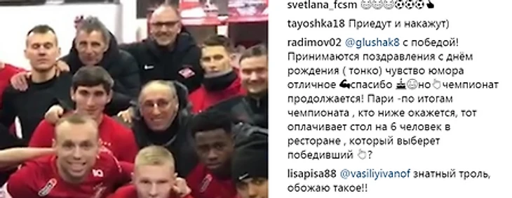 Пари по итогам чемпионата: кто ниже окажется, тот оплачивает стол на 6 человек в ресторане, который выберет победивший», – написал Радимов в инстаграме.