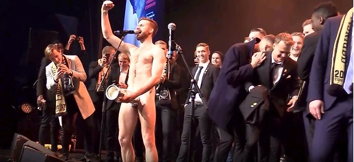 Полузащитник команды Александер Андреассен, обращаясь к фанатам, разделся под музыку прямо на сцене, прикрыв интимные места трофеем.