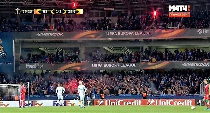 «Реал Сосьедад» – «Зенит». Судья приостанавливал матч из-за файеров, летевших с сектора гостей