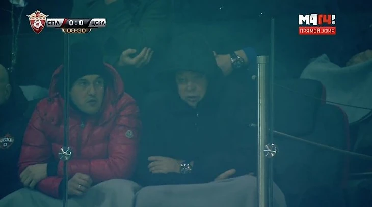 Слуцкий на «Открытие Арене» наблюдает за ходом матча в компании другого экс-сотрудника ЦСКА – Олега Яровинского, – также покинувшего «Халл» 4 декабря.