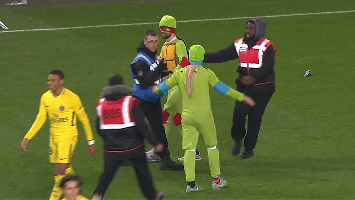 На 75-й минуте встречи форвард Эдинсон Кавани забил третий гол парижан, после чего два фаната в костюмах черепашек-ниндзя прорвались к игрокам.