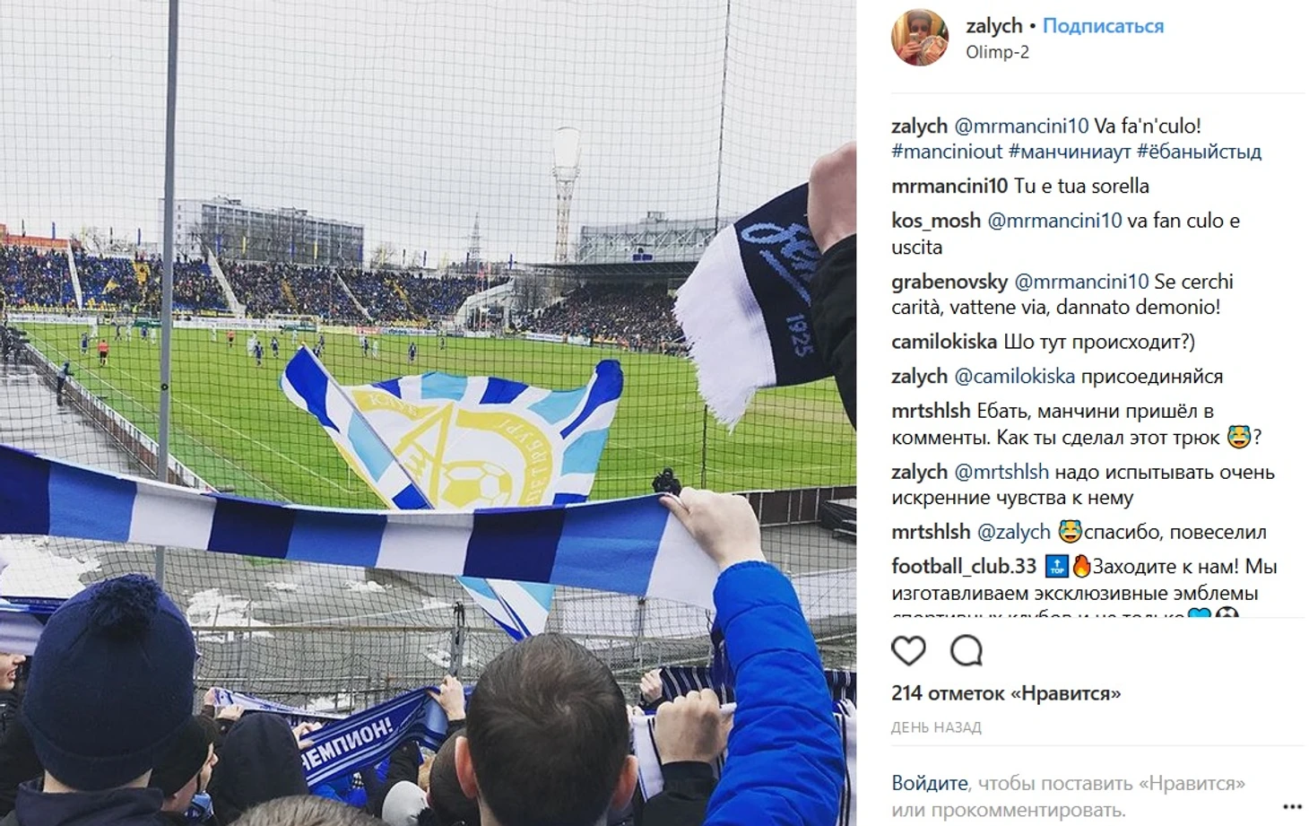 После гостевого матча 22-го тура премьер-лиги с «Ростовом» (0:0) фанат петербургской команды Игорь Залепухин опубликовал пост, написав «Манчини, иди на хрен», отметил в публикации итальянца и поставил хэштеги #manciniout, #манчиниаут, #ё*аныйстыд.