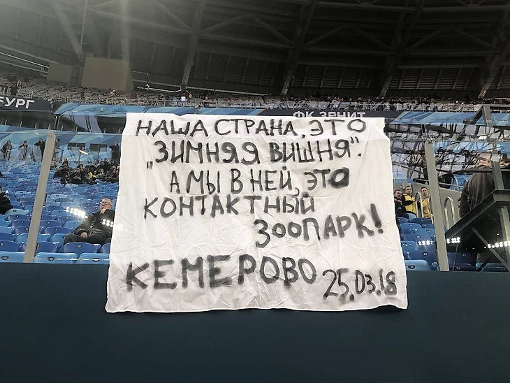 Служба безопасности стадиона «Крестовский» перед началом матча между сборными России и Франции попросила российских болельщиков снять один из баннеров про трагедию в Кемерове.